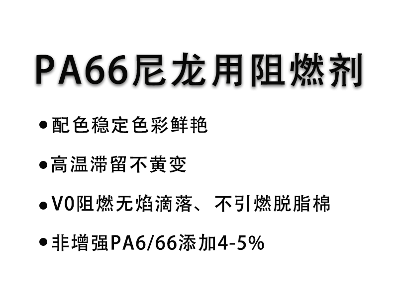增强PA6 PA66溴锑BPS阻燃体系,降低Sb2O3用量70%比例,降低成本;增强PA6 PA66红磷阻燃母粒体系,降低红磷母粒40%用量,制品颜色更优;增强PBT溴锑阻燃体系,降低Sb2O3用量40-50%比例,降低材料成本